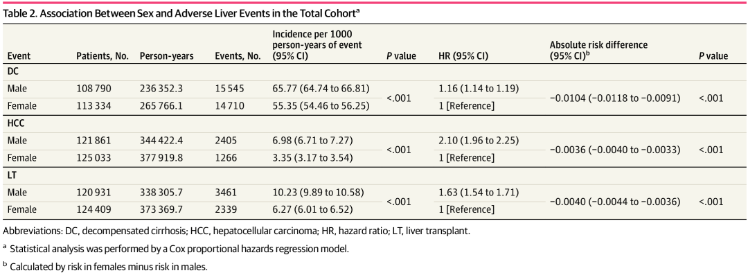 表2. 整体研究队列中性别与不良肝脏事件之间的关联