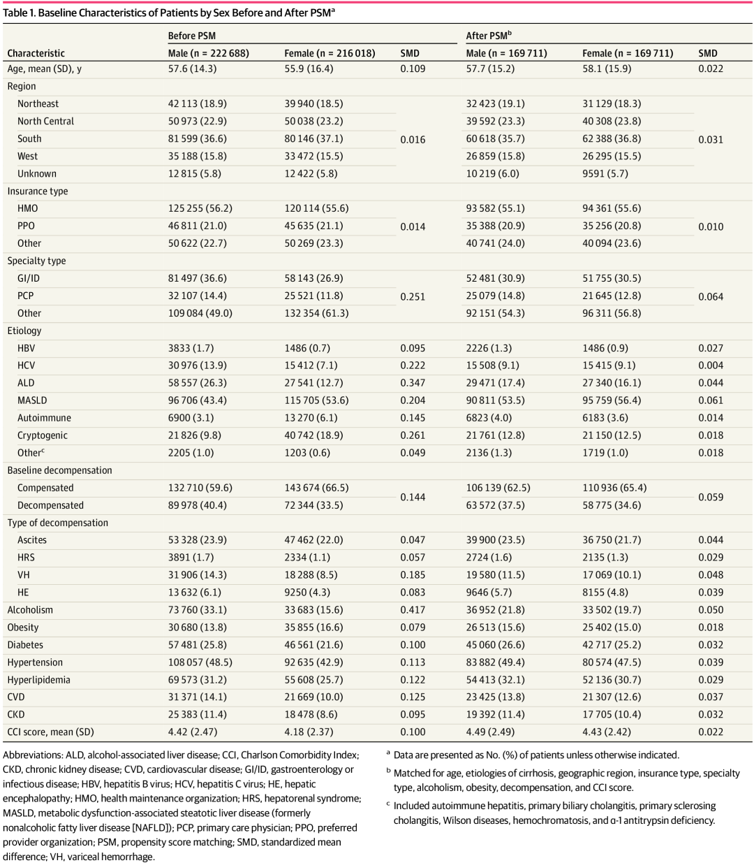 在倾向评分匹配前,男性患者与女性患者间存在以下特征差异:对比女性患者,男性更多就诊于胃肠/传染病专科医生(36.6% vs. 26.9%)、Charlson合并症指数评分均值略高(4.42±2.47 vs. 4.18±2.37)。病因分布方面,男性更易患乙型肝炎病毒感染(1.7% vs. 0.7%)、丙型肝炎病毒感染(13.9% vs. 7.1%)及酒精相关肝病(26.3% vs. 12.7%),而女性更易患代谢功能障碍相关脂肪性肝病(53.6% vs. 43.4%)、自身免疫性肝病(6.1% vs. 3.1%)及隐源性肝硬化(18.9% vs. 9.8%),(表1)。