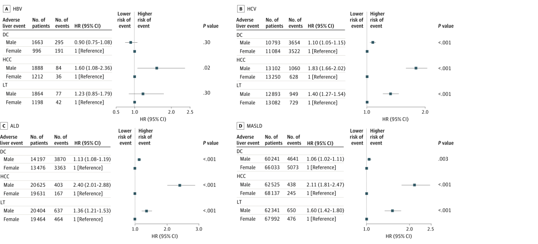 图1. 乙型肝炎病毒、丙型肝炎病毒、酒精相关性肝病及代谢功能障碍相关脂肪性肝病所致肝硬化患者中性别与不良肝脏事件的关联
