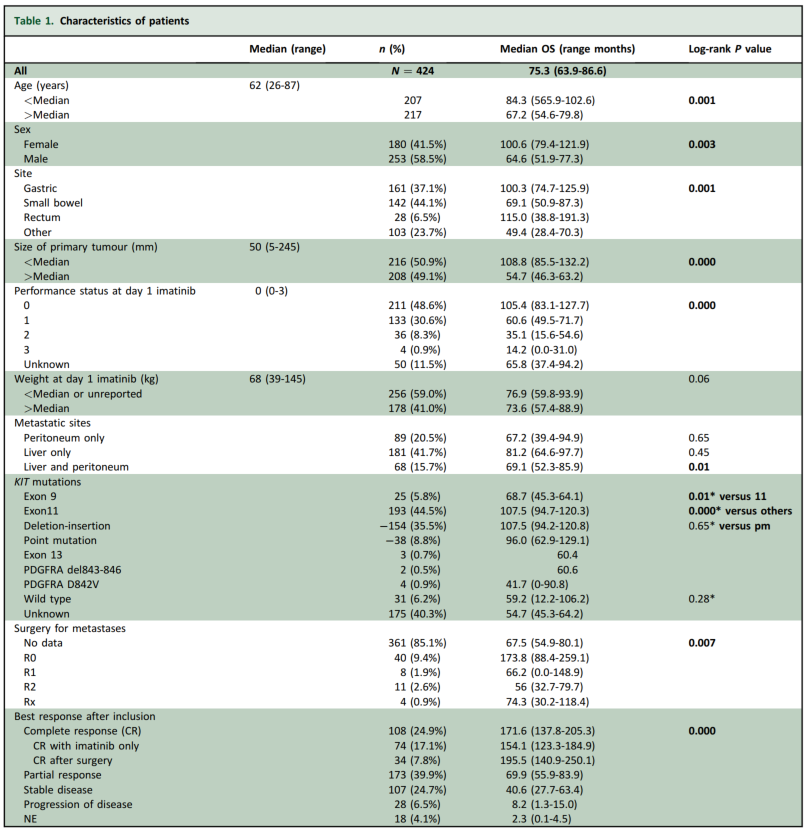 主要疗效数据所有患者中,58.5%为男性,一半患者在开始接受伊马替尼治疗时体能状态评分为0,大多数患者的肿瘤位于胃(37.1%)和小肠(44.1%)。原发肿瘤的中位大小为50 mm(图1)。