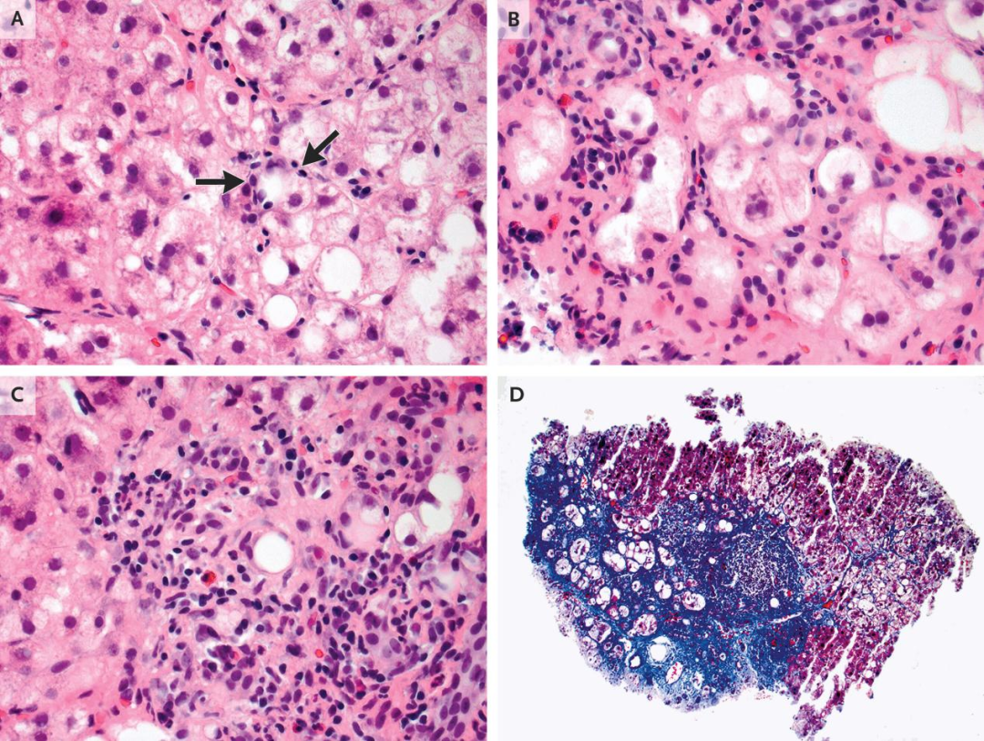 Corey医生指出,肝活检见大泡性脂肪变、肝细胞气球样变和小叶炎症,证实MASH诊断。这些肝损伤特征区分了MASH与MASLD(后者无这些特征)。门静脉炎症也可出现于MASH,但非诊断必需。本例最重要的特征是进展性纤维化。3或4期纤维化的死亡或肝移植风险为1/3.97至1/11.97,需积极管理。
