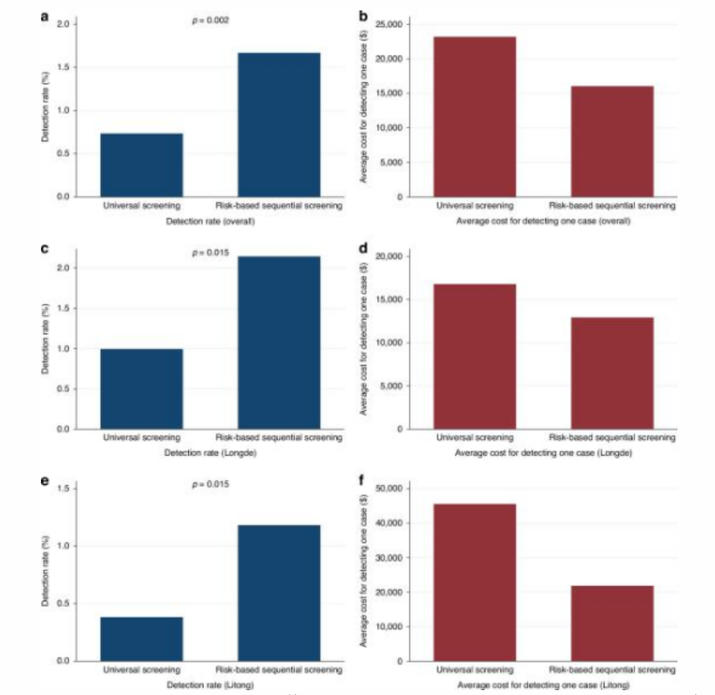 图1. 基于风险的序贯筛查(2023年)与普筛(2018-2022年)中上消化道肿瘤检出率及单例病例平均筛查成本对比结果