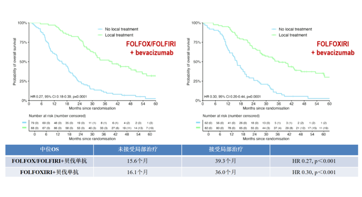 CAIRO5研究[9]也在伴初始不可切除的CRLM患者的确定亚组中,对目前最有效的系统治疗方案进行了前瞻性随机比较,包括在RAS/BRAFV600E突变型和(或)右半和左半原发CRLM中对比FOLFOX/FOLFIRI联合贝伐珠单抗和FOLFOXIRI联合贝伐珠单抗的疗效,旨在发现初始不可切除CRLM患者的最佳诱导方案。RAS/BRAFV600E突变型和(或)右半结肠患者的结果显示,FOLFOXIRI+贝伐单抗组的中位PFS较FOLFOX/FOLFIRI+贝伐单抗组有所延长(10.6个月vs.9个月);与未接受局部治疗患者相比,接受局部治疗的患者OS显著延长(图3),进一步证实了三药方案在转化治疗中的潜力。