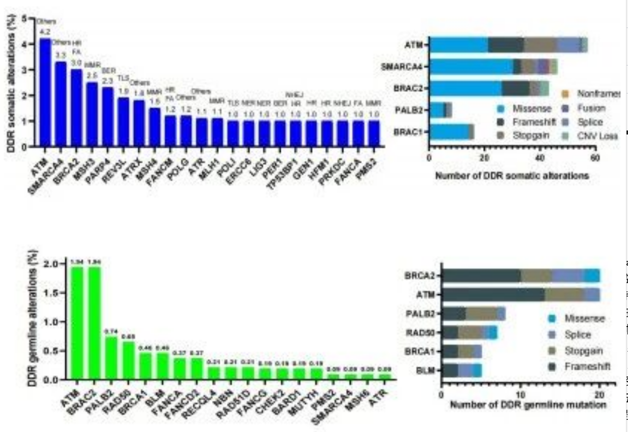 王理伟教授团队针对1080例中国人群胰腺癌DDR特征的回顾性分析显示(图4):约28%胰腺癌患者存在DDR基因体系突变(前五位:ATM、SMARCA4、BRCA2、MSH3、PARP4),8%存在胚系突变(前五位:ATM、BRCA2、PALB2、RAD50、BRCA1),为PARP抑制剂在中国人群的应用提供数据支撑,目前团队正开展CVL218(PARP抑制剂)在晚期实体瘤患者中的Ⅰb期研究,进一步探索疗效与安全性。