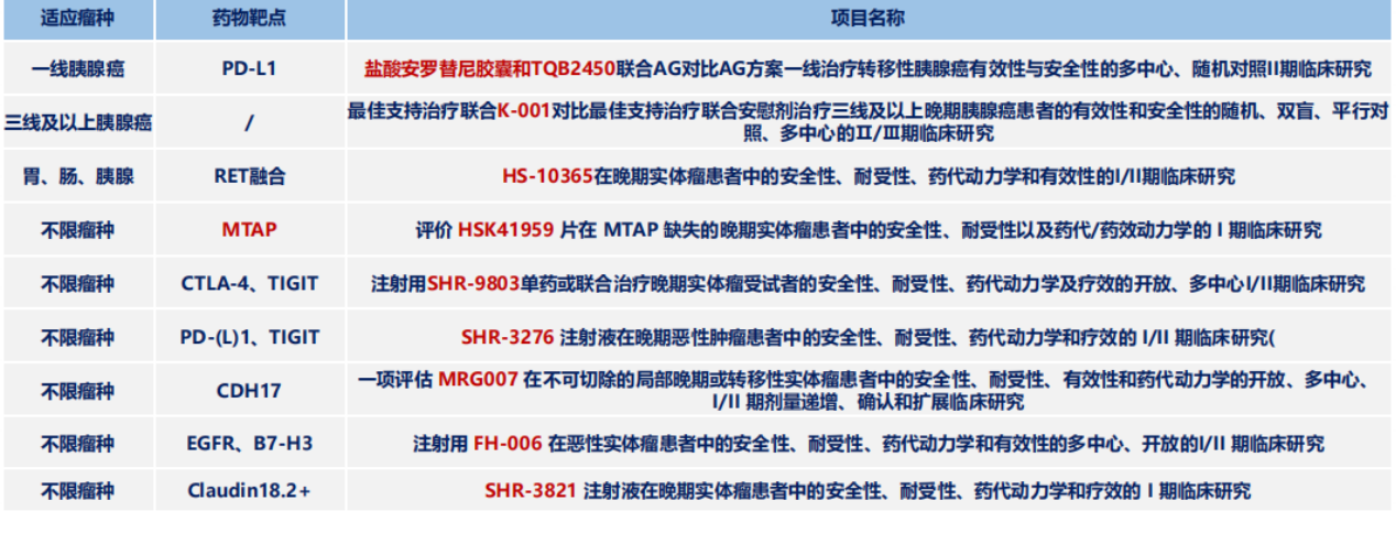 王理伟教授指出,晚期胰腺癌治疗已进入“精准分层、多靶点探索”的新时代,未来需重点关注三方面:1.生物标志物指导:加强基因检测普及(如NGS检测),明确KRAS亚型、DDR突变、Claudin18.2表达等,实现“量体裁衣”式治疗;2.联合治疗探索:如靶向药物联合化疗(HRS-4642+AG方案)、ADC联合靶向药物(SHR-A1921+HRS-4642)、免疫检查点抑制剂联合抗血管生成药物(TQB2450+安罗替尼),通过机制协同提升疗效;3.中国原研药物研发:加快本土创新药物(如KRAS G12D抑制剂、Claudin18.2 ADC)研发,积累更多中国人群数据,提升本土诊疗水平。当前,王理伟教授团队已启动多项临床研究(表2),涵盖PD-L1、RET、MTAP、CTLA-4/TIGIT等靶点,覆盖一线至后线治疗,未来将为晚期胰腺癌患者带来更多生存希望,推动“癌中之王”的诊疗困境逐步突破。