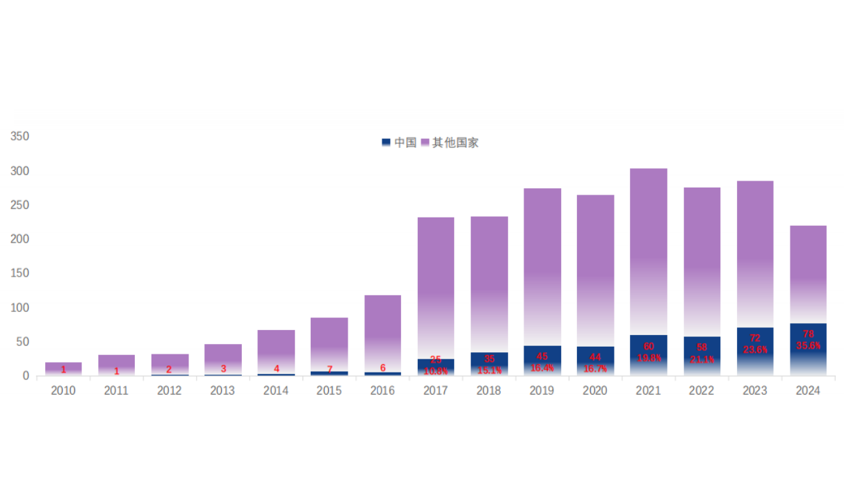 全球胰腺癌研究中,中国贡献度显著提升:从2017年占比10.8%增至2024年35.6%(图2),本土Ⅲ期研究成果突出——如NOTABLE研究(尼妥珠单抗联合吉西他滨)、PAN-HEROIC研究,均基于中国人群数据,为本土患者提供更适配的治疗方案,标志中国胰腺癌研究从“跟跑”向“部分领跑”转变。