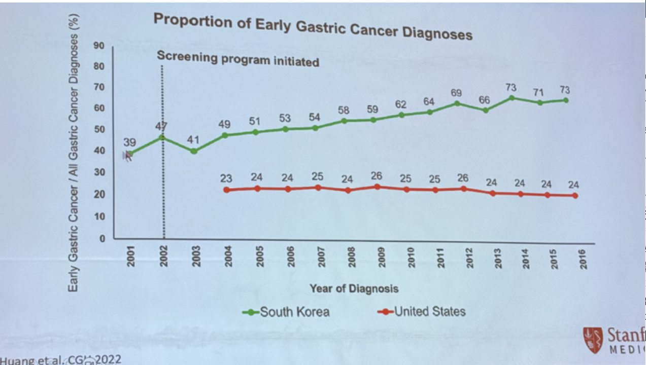 从早期胃癌诊断比例来看,韩国与美国的差异显著。根据Huang等的研究,韩国因普及胃癌筛查,2002年早期胃癌诊断比例约47%,此后逐年上升,2010年后稳定在70%左右(2016年达73%);而美国2002年该比例仅约26%,2010年后始终维持在24%~26%的较低水平(图2),这种差距主要源于韩国推行基于人群的胃癌筛查项目,美国则以机会性筛查为主。