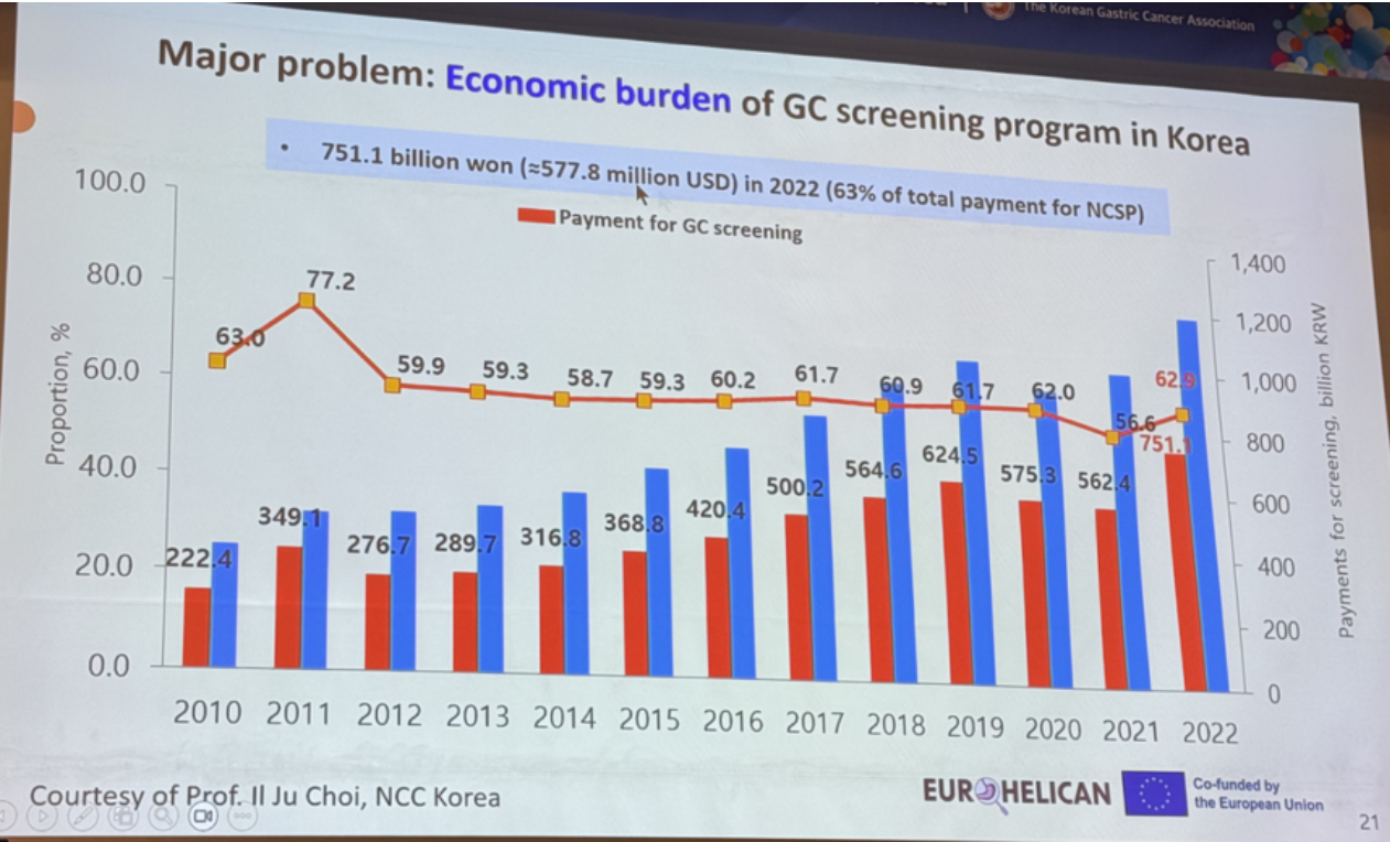 不过韩国的胃癌筛查也面临显著经济负担:2022年韩国胃癌筛查支出达7511亿韩元(约合5.778亿美元),占国家癌症筛查项目(NCPP)总支出的63%。从2010~2022年趋势来看,筛查支出从2010年的222.4亿韩元增至2022年的751.1亿韩元,涨幅超3倍;占NCPP总支出的比例也从2010年的56.6%波动上升,2021年达77.2%,2022年回落至63%(图3),相关数据由韩国国家癌症中心Il Ju Choi教授提供,且受欧盟共同资助项目EUR HELICAN支持。
