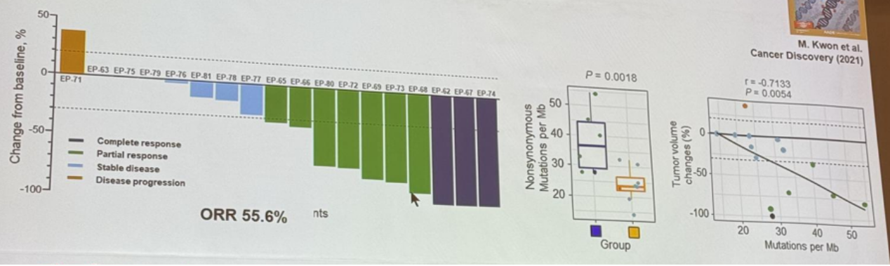 M.Kwon等进行一项研究表明,高肿瘤突变负荷(TMB)与ICB疗效显著正相关(P=0.0018, r=-0.7133),尤其是微卫星高度不稳定(MSI-H)亚型患者表现出更强的免疫原性(图2)。一项纳入772例患者的回顾性分析显示,MSI-H肿瘤的平均非同义突变频率达每兆碱基5–10个,远超其他分子分型。这类肿瘤因累积大量新抗原而被CD8+ T细胞识别,同时CXCL13趋化因子招募B细胞形成三级淋巴结构,进一步增强抗肿瘤活性。