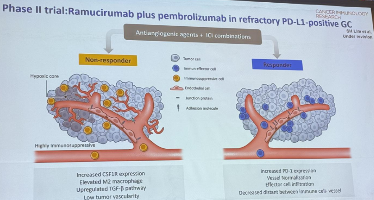 SH Lim等进行一项研究发现化疗后部分CLDN18.2阴性患者可转为阳性,且与纤维化肿瘤微环境(TME)相关,这为CLDN18.2靶向治疗提供了新的视角。此外,他们团队进行的Ramucirumab联合帕博利珠单抗在难治性PD-L1阳性胃癌中的Ⅱ期试验也取得了积极结果,尽管免疫抑制性微环境仍是治疗抵抗的主要原因。研究者通过多组学整合分析发现,对抗血管生成靶向联合免疫治疗应答者的主要分子特征包括:PD-1表达增加、血管正常化、效应细胞浸润以及免疫细胞与血管之间的距离减少等(图4)。