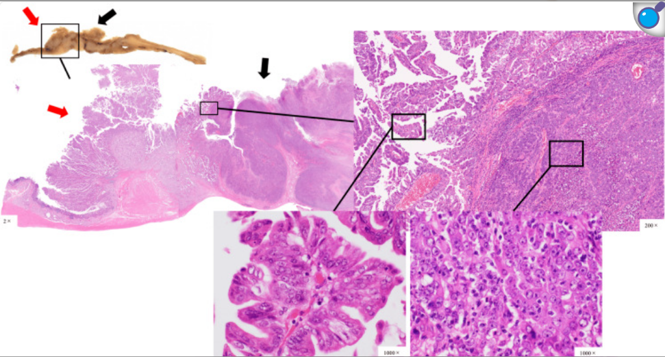 图2. 增强CT描显示胃窦壁增厚(红色圆圈)和幽门环附近淋巴结明显肿大(红色箭头) 患者接受开腹远端胃切除术、D2淋巴结清扫及Roux-en-Y重建。手术时间233分钟,失血48 ml,术后无并发症,第8天出院。 肉眼检查发现,Ⅲ型肿瘤位于胃前臂区,Ⅰ型肿瘤位于幽门环至十二指肠球部,两肿瘤在幽门环处交汇,与术前内镜结果不同(图3)。组织病理学检查显示Ⅲ型肿瘤以低分化腺癌为主,Ⅰ型肿瘤以中分化腺癌为主,边界清晰(图4)。