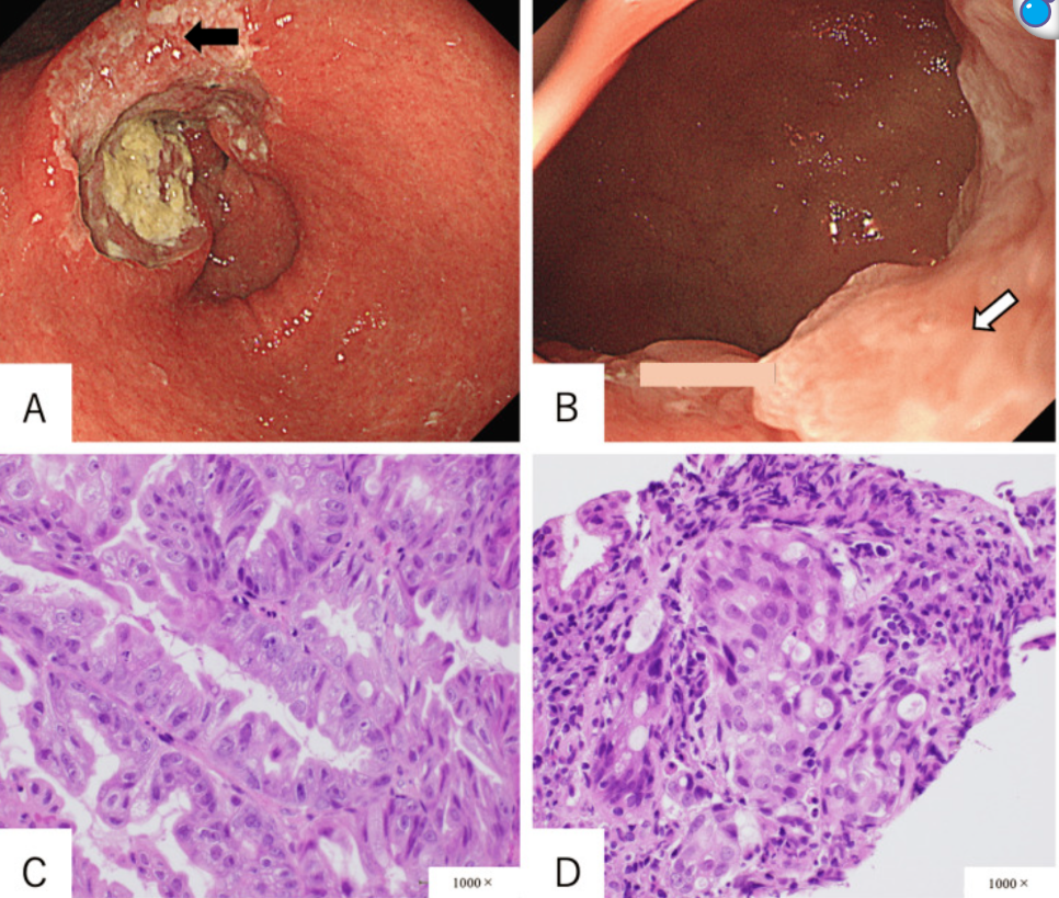 本期《岂有此“例”》报告一例非壶腹型十二指肠癌(NADC)与进展期胃癌形成的碰撞瘤,此前未见相关病例报道。患者为82岁女性,因黑便和贫血就诊,经诊断为胃窦小弯侧进展期胃癌。肿瘤部分浸润幽门环,但在可观察范围内未发现十二指肠球部受累。增强CT显示胃窦至幽门环壁增厚,小弯侧肿胀及幽门下淋巴结肿大。患者接受远端胃癌根治术及D2淋巴结清扫。病理结果显示胃癌(乳头状腺癌与中分化管状腺癌)呈MUC5AC阳性,十二指肠癌(实性低分化腺癌为主)呈MUC5AC和MUC6阳性,两肿瘤在幽门环处交汇。淋巴结转移同时来自胃和十二指肠癌。对于合并十二指肠浸润的胃癌患者,需考虑十二指肠癌并存可能及淋巴结清扫范围。 病例再现 1.患者基本信息 女性,82岁,有高血压、高脂血症及幽门螺杆菌根除史,因头晕和贫血转诊。患者无发热,心率为70次/min,血压为118/83 mmHg,室内空气中的氧饱和度为100%。 2.辅助检查 实验室检查显示血红蛋白6.6 g/dL。