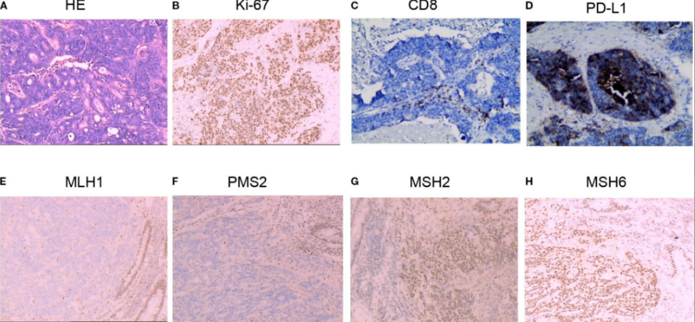 6.实验室检查术后病理显示8 cm低分化腺癌(图1A),肿瘤浸润超过固有肌层至纤维脂肪组织。淋巴结转移3/14枚,伴2个癌结节。免疫组化(IHC)结果:Ki67 80%(图1B),CD8+T淋巴细胞<50个/mm2(图1C)。肿瘤细胞及免疫细胞PD-L1弥漫表达,联合阳性评分(CPS)=20(图1D)。MLH1(-)、PMS2(-)、MSH2(+)、MSH6(+)(图1E-H)。