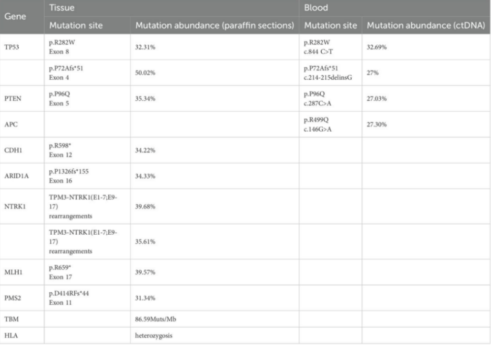 对患者术后组织蜡块及外周血ctDNA进行下一代测序(NGS)分析,结果显示MSI-H、TMB-H(86.59 Muts/Mb)、HLA杂合性、KRAS/NRAS/BRAF野生型、NTRK1重排及PTEN、TP53、CDH1等基因突变(表1)。
