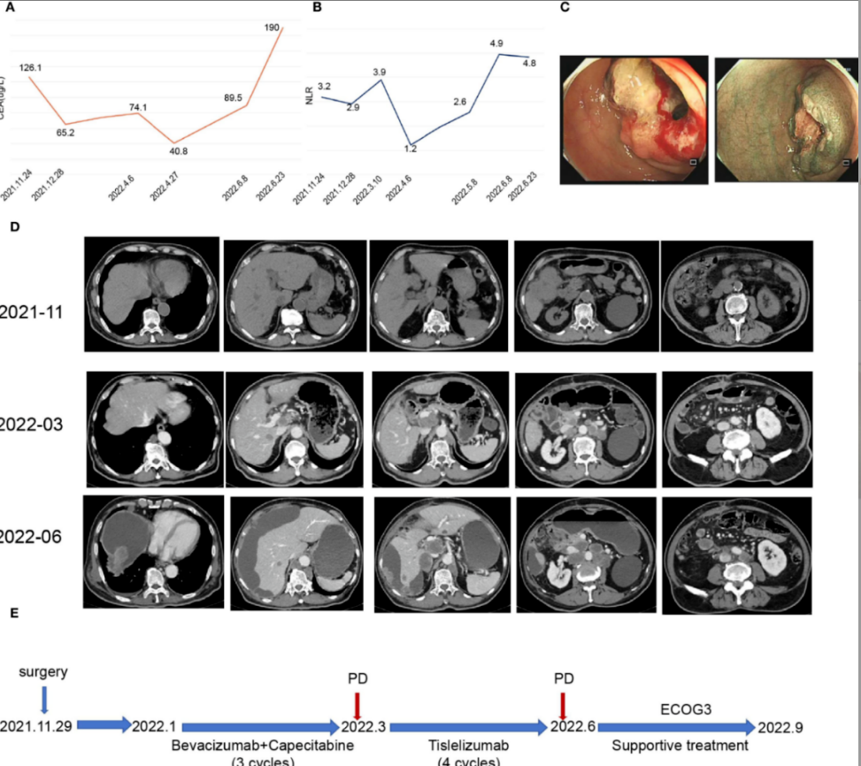 图2. 患者临床数据及治疗史。(A)治疗期间癌胚抗原(CEA)水平变化曲线。(B)治疗期间中性粒细胞-淋巴细胞比值(NLR)变化曲线。(C)肠镜显示距肛门60 cm处菜花样病灶环周生长致管腔狭窄。(D)代表性影像学图像展示治疗过程。(E)患者治疗时间轴。
