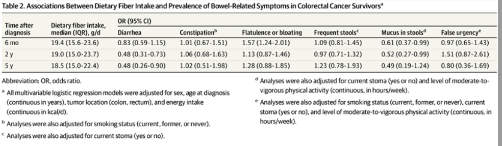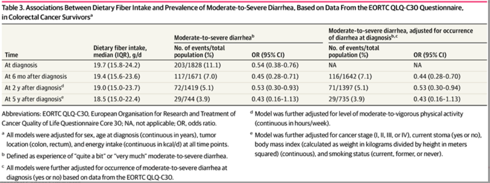 较高的纤维摄入量(每增加10克/天)与确诊后6个月(OR=0.44)和2年(OR=0.53)的中重度腹泻较低的发生率独立相关,风险分别降低56%、47%(均已调整确诊时的腹泻状况),5年时的关联不具统计学显著性。