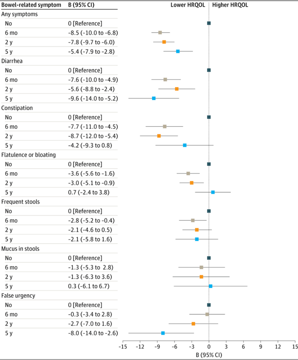 多变量线性回归分析表明(图2),存在任何肠道相关症状(对比无症状)均与所有时间点较差的健康相关生活质量评分相关。在各类具体症状中: 腹泻与所有时间点的生活质量评分降低关联最强,且在5年时对生活质量的负面影响最大(B系数:-9.6)。