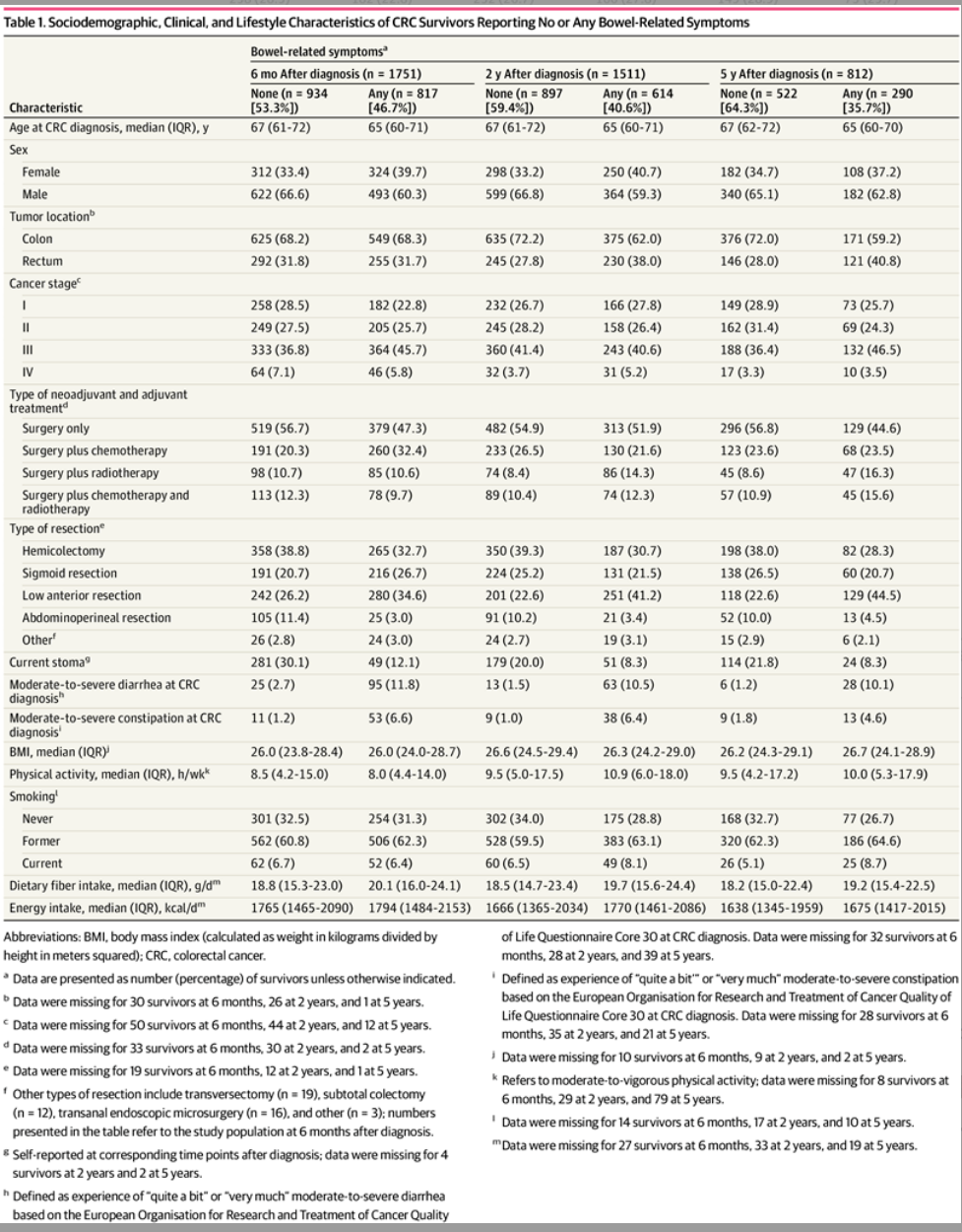 导读:结直肠癌幸存者普遍面临腹泻、便秘、腹胀等多种肠道相关症状的长期困扰,严重影响其生活质量。现有研究已提示直肠肿瘤、放疗及特定手术方式是引发这些症状的风险因素。然而,关于该人群肠道症状的长期演变规律及不同治疗方案间症状差异的纵向数据仍较为缺乏,而这类研究对于识别高危人群和优化管理策略至关重要。 在症状管理的实践中,增加膳食纤维摄入是许多幸存者常用的自我调节方式。现有针对普通人群的研究显示,较高纤维摄入有助于改善排便模式和减少肠道症状,这使其成为结直肠癌幸存者症状管理中一个值得深入探讨的生活方式因素。然而,该策略在这一特定人群中的有效性尚缺乏系统证据支持。 为此,研究人员基于一项大型前瞻性队列研究的数据系统分析了结直肠癌患者在确诊后6个月至5年内肠道症状的动态变化。研究通过多维度分析,不仅揭示了不同治疗方式(包括手术方式与治疗策略)下的症状分布特征,更重点探讨了膳食纤维摄入与各类症状之间的关联。研究发现,近半数结直肠癌幸存者在确诊后6个月内存在肠道相关症状,而超过三分之一的患者在确诊后5年内仍存在相关症状。较高的膳食纤维摄入量与中重度腹泻发生率的降低显著关联。且肠道症状与生活质量评分相关,其中腹泻对生活质量的负面影响最为突出。 研究方法 本队列研究数据来源于一项结直肠癌营养和生活方式因素纵向观察研究(COLON研究),旨在探讨结直肠癌幸存者中膳食纤维摄入与肠道相关症状及健康相关生活质量的关系。研究最终纳入2010年8月至2020年2月期间荷兰11家医院招募的Ⅰ~Ⅳ期结直肠癌手术幸存者。 通过医院记录、荷兰结直肠审计数据库、荷兰癌症登记处及在确诊时、确诊后6个月、2年和5年多次发放的问卷,系统收集患者的临床资料(如治疗策略、手术类型)、社会人口学特征、生活方式信息以及肠道相关症状(包括腹泻、便秘、胀气等)的发生情况。习惯性膳食纤维摄入量通过经过验证的204项食物频率问卷进行评估。健康相关生活质量则采用国际通用的EORTC QLQ-C30量表进行测量。 在统计分析方面,首先对研究人群的基本特征进行了描述。主要采用多变量逻辑回归模型,分别在不同随访时间点(确诊后6个月、2年、5年)分析膳食纤维摄入量(作为连续变量,每增加10克/天)与出现任何肠道相关症状、以及中重度腹泻或便秘之间的关联,计算比值比(OR)及其95%置信区间(95%CI),并对潜在的混杂因素进行校正。此外,还通过多变量线性回归模型,评估了肠道相关症状的存在与否对健康相关生活质量评分的影响。 研究结果 研究人员在COLON研究的2 113例结直肠癌幸存者中,排除26例未接受手术者以及17例手术状态数据缺失者。在其余2 070例接受手术的患者中,确诊后6个月、2年和5年的存活率分别为98.5%、92.8%、83.0%。各时间点存活患者的问卷回收率统计显示,在6个月、2年和5年内分别有85.9%、78.7%、54.4%(13.1%尚未达到5年随访时间点)提供了可用的肠道相关症状数据。 患者的确诊中位年龄为66岁。在6个月内有肠道相关症状数据的幸存者中,男性占63.7%;在有肿瘤位置数据的患者中(1 721例),68.2%被确诊为结肠癌。在确诊6个月、2年和5年内分别有46.7%、40.6%、35.7%报告有肠道相关症状(图1A)。有/无肠道相关症状的幸存者特征见表1。