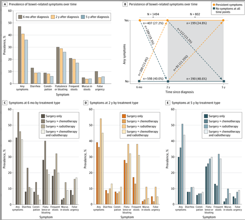 在确诊后2年和5年内,肠道相关症状在接受过放疗的幸存者中最为常见(2年:53.8%,5年:51.1%)。接受放疗的患者中,肠道相关症状的发生率在确诊后6个月至2年间有所上升,并在2年至5年间保持稳定,提示这些症状可能是治疗的迟发性不良反应。