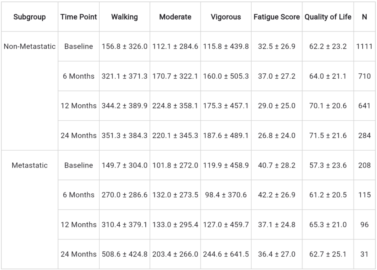 在非转移性结直肠癌患者中,步行在缓解疲乏方面显示出最稳定的益处(β=-2.69),尤其在确诊后第一年获益更为显著(β=-2.29)。中度和高强度活动主要在后期生存阶段显示出益处(中度体力活动:β=-1.94;高强度体力活动:β=-1.79)。确诊后12个月时的体力活动(而非基线水平)是预测24个月后较低疲乏与较好生活质量的最强独立因素(OR=0.79,P=0.041)。在转移性疾病患者中,身体活动与改善结局的关联不显著。