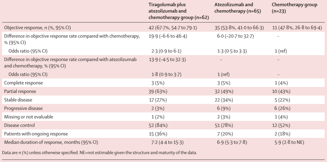 安全性方面,Tiragolumab+阿替利珠单抗+化疗组、阿替利珠单抗+化疗组和单纯化疗组分别有49例(79%)、52例(80%)和17例(74%)患者发生3~4级不良事件,分别有36例(58%)、33例(51%)和11例(48%)患者发生严重不良事件。最常见的治疗相关不良事件是恶心和食欲下降。无治疗相关死亡事件。