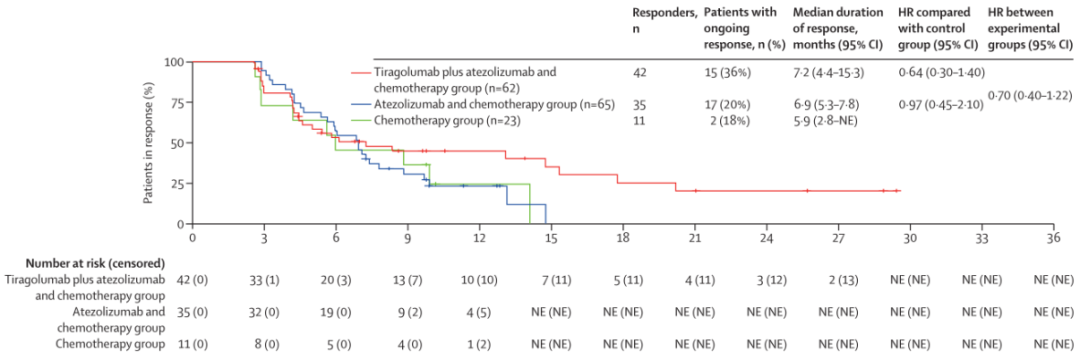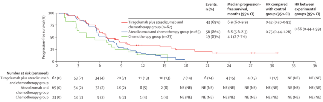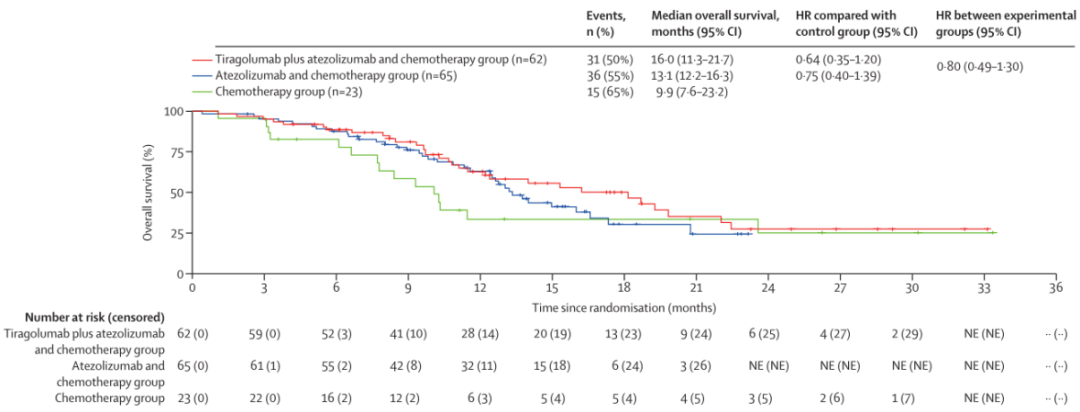 2020年6月5日至2022年11月8日期间,共有152例患者被随机分配至Tiragolumab联合阿替利珠单抗和化疗组(n=63)、阿替利珠单抗联合化疗组(n=65)或单纯化疗组(n=24)。Tiragolumab+阿替利珠单抗+化疗组的中位随访时间为10.9个月(IQR=7.1~17.3),阿替利珠单抗+化疗组为11.4个月(IQR=7.9~14.7),单独化疗组为8.7个月(IQR=3.9~12.0)。
