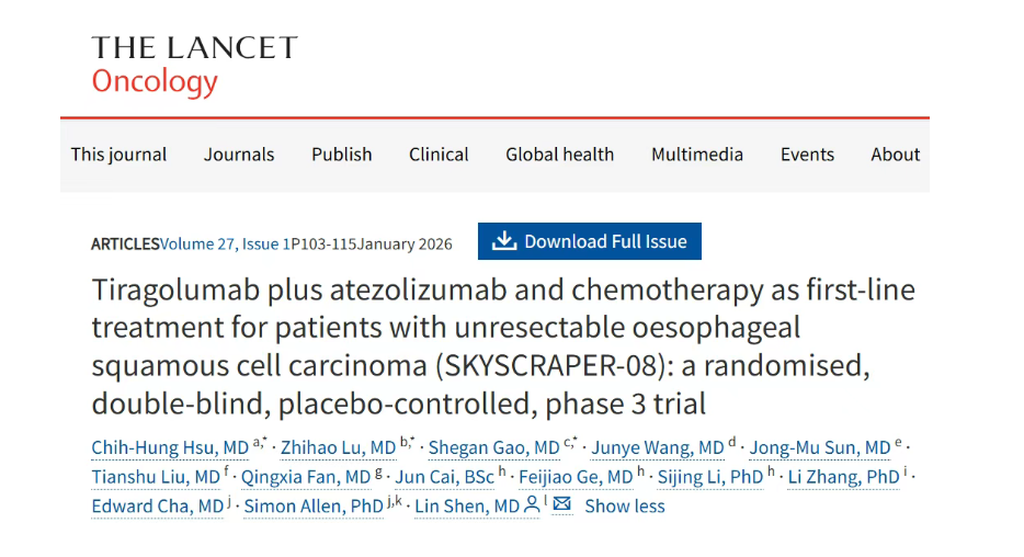 T细胞免疫球蛋白和免疫受体酪氨酸抑制基序结构域(TIGIT)是一种抑制性免疫检查点受体,在多种免疫细胞上高度表达,与PD-1共表达并协同抑制T细胞功能。Tiragolumab是一种全人源抗TIGIT单克隆抗体。早期研究提示,其联合PD-L1抑制剂阿替利珠单抗在晚期实体瘤中显示出可控的安全性和初步疗效。MORPHEUS-EC研究旨在初治的局部晚期不可切除或转移性食管癌患者中,评估Tiragolumab联合阿替利珠单抗及化疗对比标准治疗(化疗联合或不联合阿替利珠单抗)的疗效与安全性。该研究结果近期发表于The Lancet Oncology杂志。本文旨在对该研究的关键数据进行梳理和评述,从而为临床实践提供信息参考。