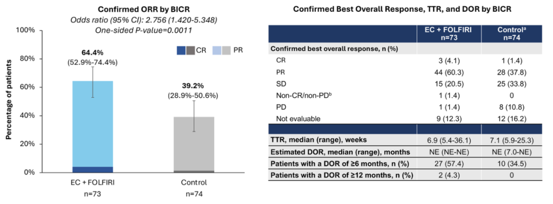 主要终点与对照组相比,EC+FOLFIRI组经BICR评估的确认ORR实现了具有临床意义和统计学显著性的改善(EC+FOLFIRI组对比对照组分别为64.4%和39.2%,优势比为2.756),达到了主要研究终点。其中,EC+FOLFIRI组中,3例(4.1%)患者达完全缓解(CR),44例(60.3%)患者为部分缓解(PR),15例(20.5%)患者最佳疗效为疾病稳定(SD),1例(1.4%)患者疾病进展(PD),9例(12.3%)患者无法评估。对照组中,1例(1.4%)患者达CR,28例(37.8%)患者为PR;25例(33.8%)患者为SD,8例(10.8%)患者为PD。12例(16.2%)患者无法评估(图1)。