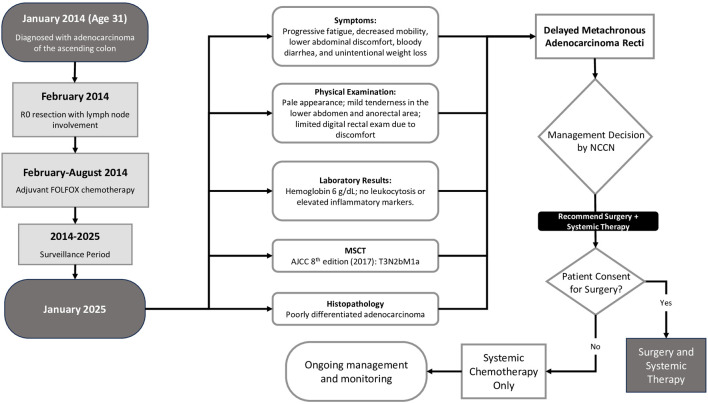 本病例展示了一例罕见的EOCRC异时性复发,发生于初次根治性治疗11年后。它强调了在标准随访方案之外,对具有侵袭性生物学行为的年轻患者开展长期个体化监测的必要性。患者拒绝可能实现根治的手术干预而选择全身化疗,突显了加强患者教育与推进共同决策的迫切性。临床医师应充分认识EOCRC独特的风险特征,包括其延迟且具侵袭性的复发模式。未来研究应致力于优化监测策略、整合分子谱分析并推动个体化治疗,以改善这一日益增长的患病人群的临床结局。