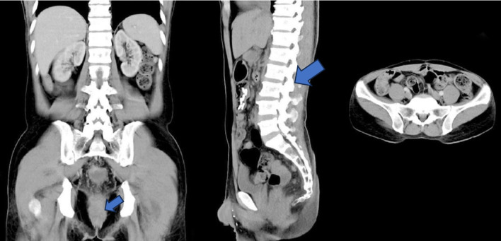 CT检查结果提示为潜在可切除的Ⅳa期CRC:腹部及盆腔CT成像显示直肠区域软组织肿块,自第二骶椎水平延伸至尾骨,疑似侵犯邻近直肠系膜组织(图2)。根据AJCC第八版标准进行临床分期,确定为T3N2bM1a,提示为潜在可切除的Ⅳa期CRC。