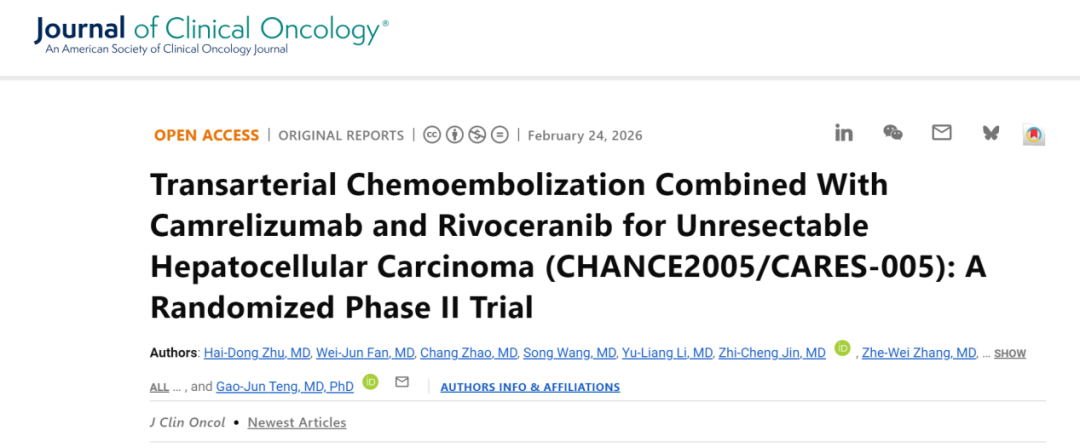 作为我国介入医学领域的领军人物,中国科学院院士、东南大学附属中大医院院长滕皋军教授一直以来积极倡导并推动肝癌诊疗的多学科协作(MDT)模式,尤其强调局部介入与系统治疗的有机融合。近日,由滕皋军院士牵头,联合全国22家中心共同开展的TACE联合卡瑞利珠单抗和阿帕替尼对比TACE治疗不可切除HCC的CHANCE2005/CARES-005研究正式在线发表于国际临床肿瘤学领域顶级权威期刊Journal of Clinical Oncology。这是该研究精彩亮相2025年美国临床肿瘤学会胃肠道肿瘤研讨会(ASCO GI)后,再次获国际医学界高度认可。这不仅标志着这一中国本土创新方案赢得了国际学术界的广泛认可,也为介入治疗联合靶向免疫治疗在不可切除肝细胞癌中的应用奠定了坚实的基础。