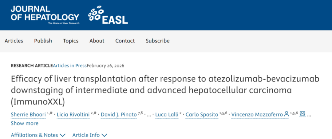 Sherrie Bhoori, et al. Efficacy of liver transplantation after response to atezolizumab-bevacizumab downstaging of intermediate and advanced hepatocellular carcinoma (ImmunoXXL). Journal of Hepatology. 2026 Feb.