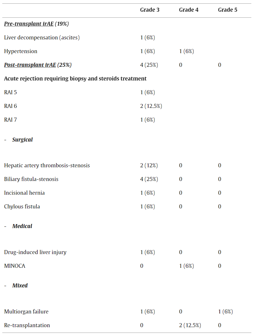 表1.HCC患者在移植前接受Atezo-Bev治疗期间及治疗后的不良事件(需住院治疗>3天)
