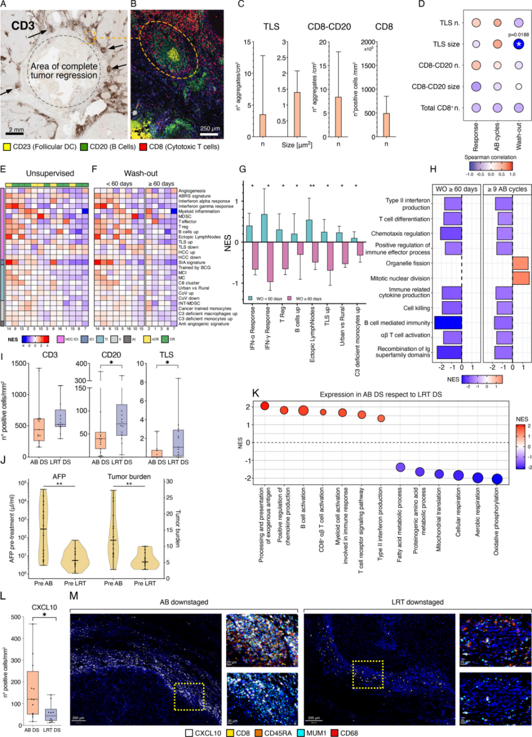 与仅接受局部治疗降期的患者相比,Atezo-Bev治疗组患者的T细胞和B细胞浸润水平显著较低(图2I),这可能与其基线肿瘤负荷更高、病史更复杂有关(图2J)。然而,独立于洗脱期和治疗持续时间后,Atezo-Bev治疗后的病灶仍保留了适应性免疫增强、B/T细胞协同募集、代谢重编程等特征(图2K)。数字病理学分析进一步证实,该组肿瘤富集了由浆细胞、记忆CD8+ T细胞和巨噬细胞构成的CXCL10+病灶周围边缘带,表明干扰素驱动的免疫级联反应在局部抗肿瘤控制中发挥了关键作用(图2L、M)。