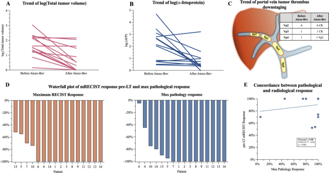 图1. 肿瘤疗效评估(A:移植前阶段肿瘤疗效的纵向变化趋势;B:AFP的变化;C:影像学检查[Atezo-Bev治疗前]与移植标本病理检查[Atezo-Bev治疗后]所评估的PVTT疗效汇总;D和E:影像学与病理学评估的肿瘤疗效呈显著相关性)