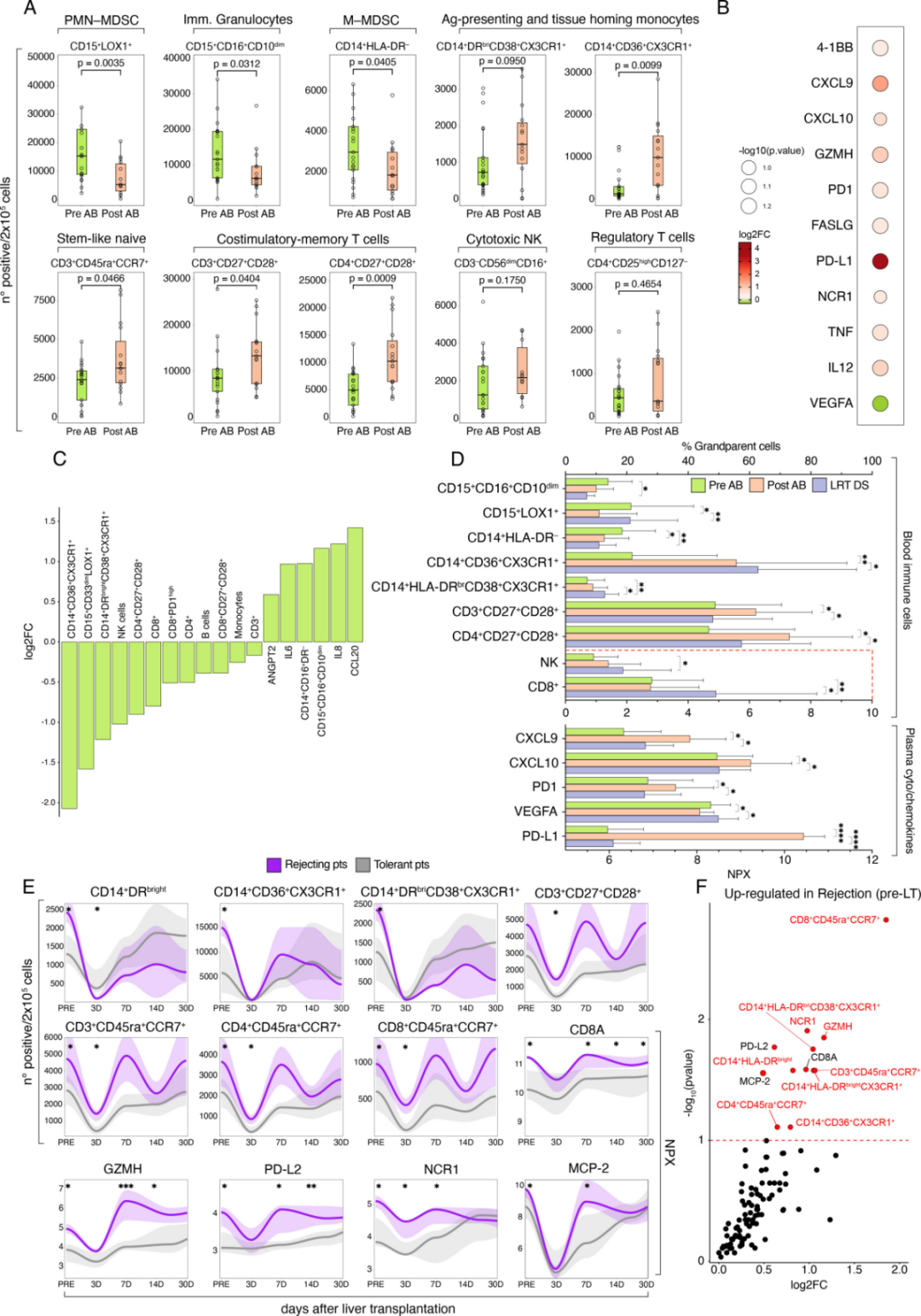 Atezo-Bev对全身免疫的影响及与移植排斥的关联Atezo-Bev在实现肿瘤降期的同时,也伴随着全身免疫的协同重塑(图3A、B)。主要表现为抑制性免疫细胞的减少,如循环中的未成熟中性粒细胞和髓源性抑制细胞(MDSC)数量下降;同时,具有抗肿瘤潜能的免疫细胞亚群出现富集,包括具备抗原提呈、代谢活跃及组织归巢能力的单核细胞,以及具有干细胞样特征的初始T细胞和共刺激性记忆T细胞(图3A)。