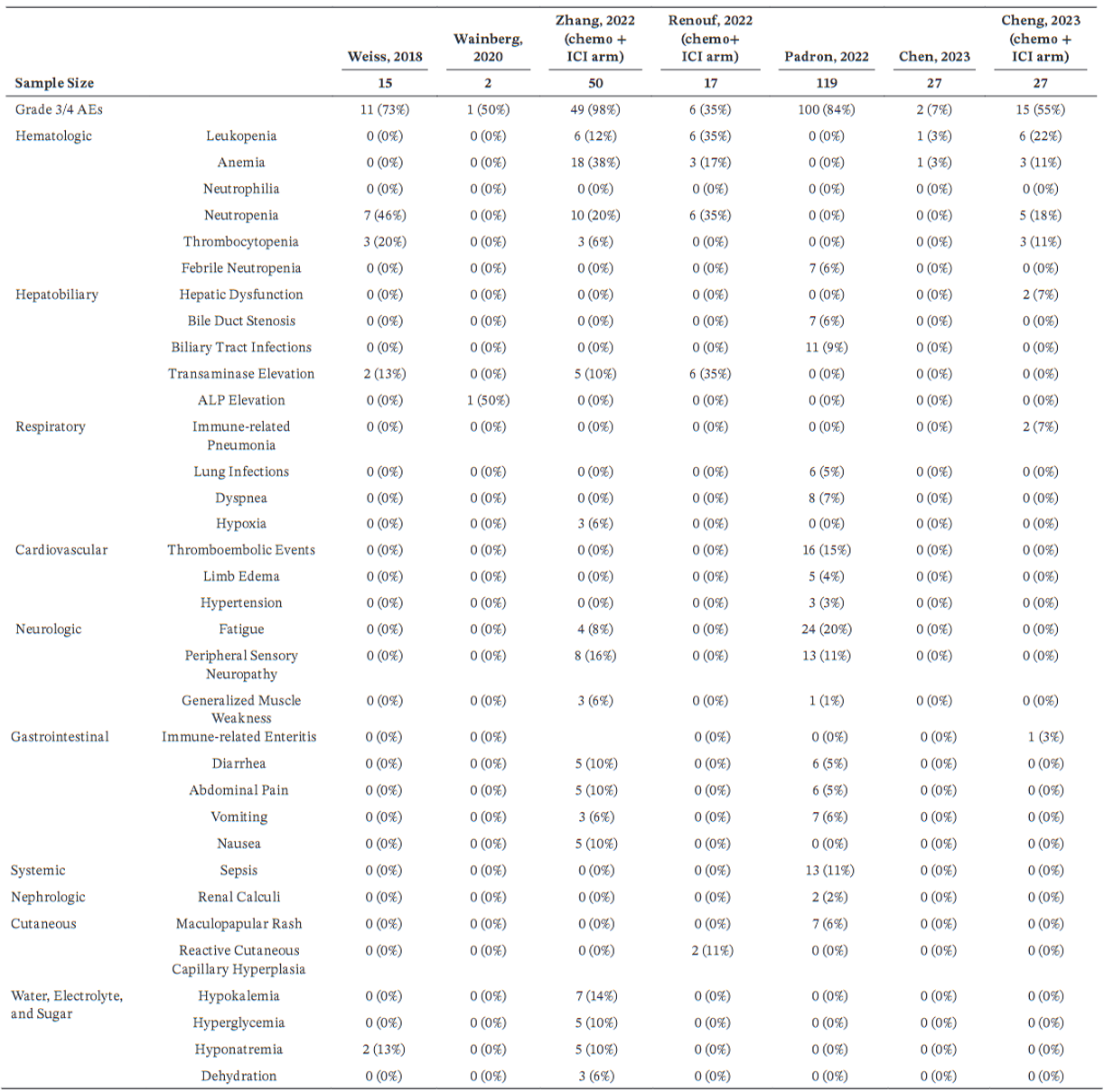 在生存获益方面,多数研究(5/7项)的中位OS超过一年,优于传统单纯化疗,且部分对照研究显示联合治疗组在OS和PFS上具有统计学意义的显著改善。安全性方面,尽管3级及以上不良事件发生率较高,但未见治疗相关死亡,最常见的为血液学毒性,其中贫血略多于中性粒细胞减少,非血液学毒性则以疲劳为主,整体安全性可控。