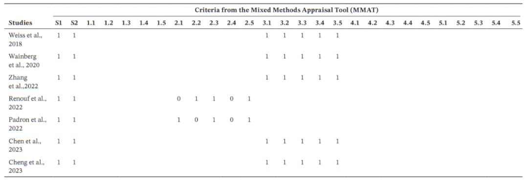 表1. 使用混合方法评估工具对纳入研究的质量评估