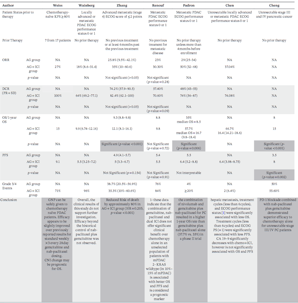 在治疗方案方面,所有研究均采用了静脉注射吉西他滨(1000 mg/m2)联合白蛋白结合型紫杉醇(125 mg/m2)的化疗方案。其中4项研究采用21天治疗周期(第1、8天化疗+第1天免疫治疗),3项采用28天周期(第1、8、15天化疗+第1、15天免疫治疗)。在使用的免疫检查点抑制剂方面,多数方案包含抗PD-1/PD-L1抑制剂(6/7项)。免疫检查点抑制剂包括PD-1抑制剂(帕博利珠单抗、纳武利尤单抗、特瑞普利单抗、卡瑞利珠单抗、替雷利珠单抗、信迪利单抗)、PD-L1抑制剂(度伐利尤单抗)以及CTLA-4抑制剂。