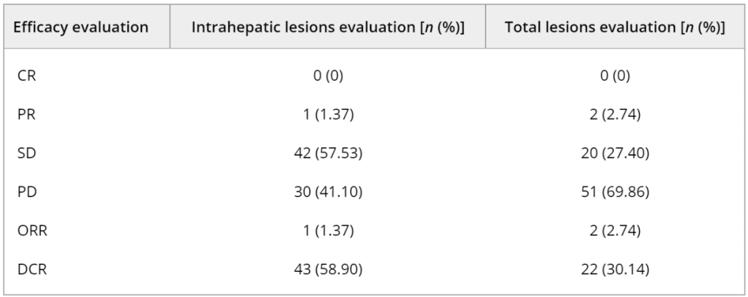 在肝脏肿瘤缓解率评估方面,1例患者达到部分缓解(PR),42例疾病稳定(SD),30例疾病进展(PD),ORR和DCR分别为1.4%和58.9%。总体疗效评估显示,2例患者达到PR,20例为SD,51例为PD,ORR和DCR分别为2.7%和30.1%(表1)。