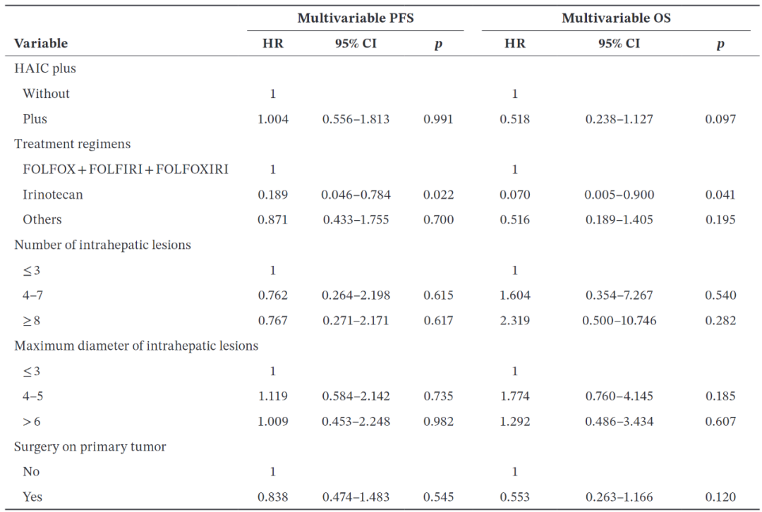 在多变量分析中对这些因素进行了考量。多因素分析确定伊立替康是OS的独立预后因素。然而,未观察到HAIC联合靶向治疗是PFS(HR=1.004,95%CI:0.556~1.813,P=0.991)或OS(HR=0.518,95%CI:0.238~1.127,P=0.097)的独立预后因素(表3)。