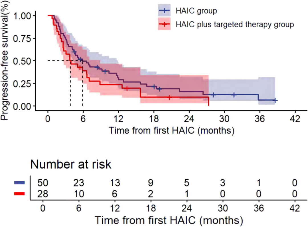 图3. 首次HAIC治疗后,HAIC单药治疗组与HAIC联合靶向治疗组的PFS比较