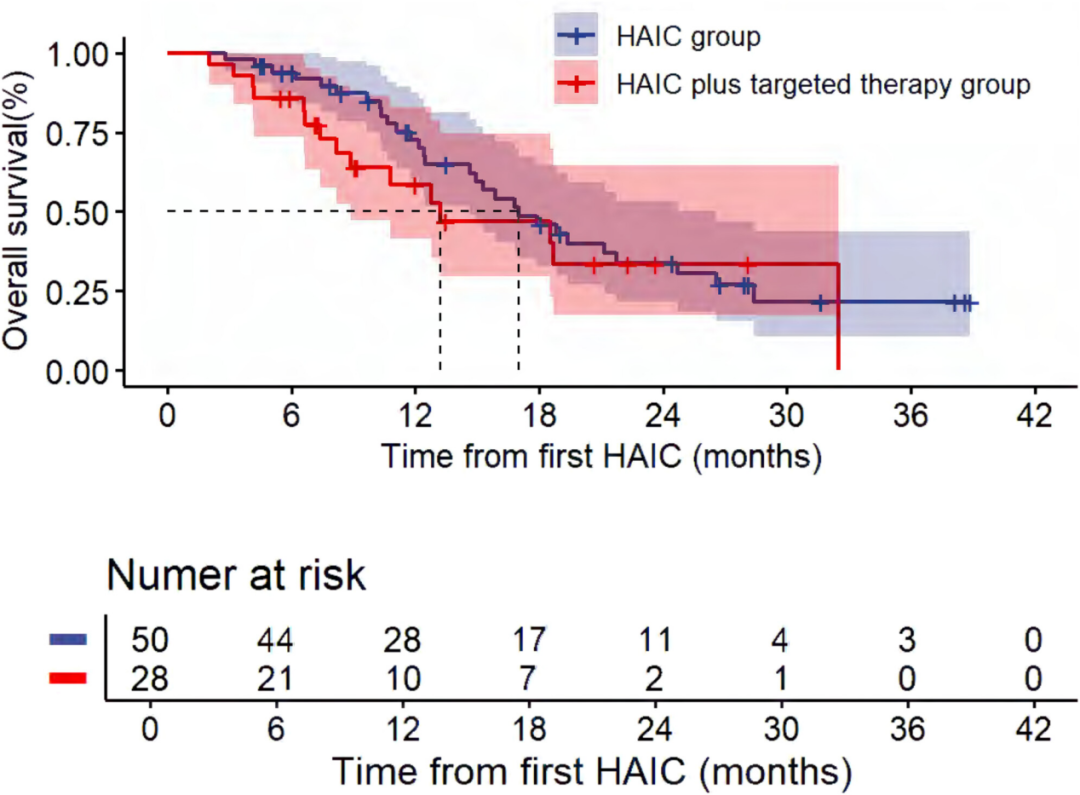 图4. 首次HAIC治疗后,HAIC单药治疗组与HAIC联合靶向治疗组的OS比较