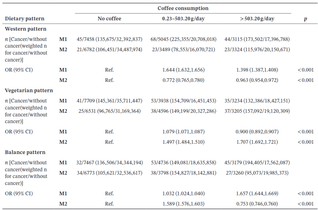 基于膳食模式的咖啡摄入与胃肠道肿瘤关联分析显示,咖啡的作用方向与强度在不同膳食模式下存在差异(表2):