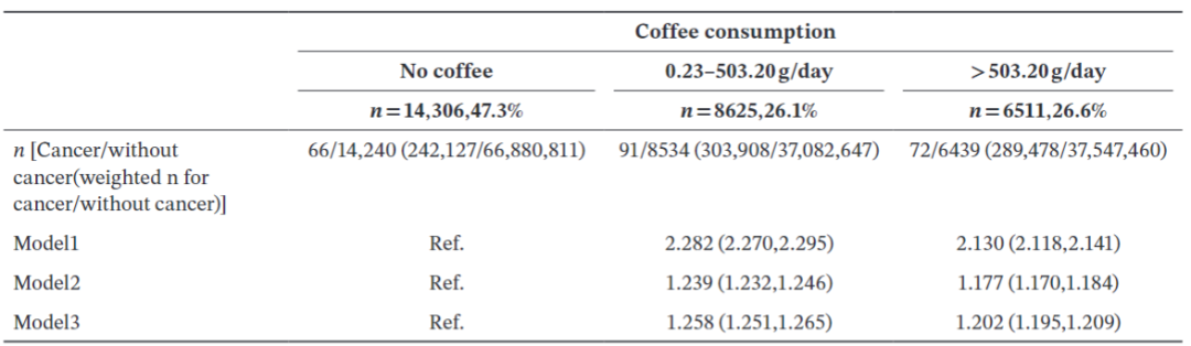 表1. 咖啡摄入与胃肠道肿瘤之间的关联