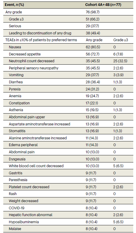患者特征:在4A+4B组(n=77)中,患者中位年龄为61.0岁(范围37.0~86.0岁)。65例(85.5%)肿瘤CLDN18.2高表达(定义为≥75%肿瘤细胞有中度至强的CLDN18膜染色),11例(14.5%)肿瘤CLDN18.2中等表达(≥50%且<75%肿瘤细胞中有中度至强的CLDN18膜染色)。63例(81.8%)患者在基线时存在可测量病灶,且大多数患者(86.5%)的原发肿瘤部位为胃。在可获得肿瘤PD-L1状态的患者(n=75)中,34.7%的患者PD-L1联合阳性评分(CPS)<1,65.3%的患者CPS≥1。Lauren分类为弥漫型53例(70.7%),肠型10例(13.3%),混合型3例(4.0%),其他类型9例(12.0%)。