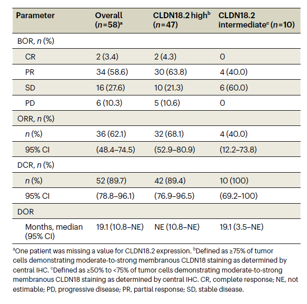 a,所有患者的PFS Kaplan-Meier曲线。b,按CLDN18.2表达水平划分的PFS Kaplan-Meier曲线。c,按PD-L1 CPS评分划分的CLDN18.2高表达患者的PFS Kaplan-Meier曲线。d,按CLDN18.2表达水平划分的OS Kaplan-Meier曲线。