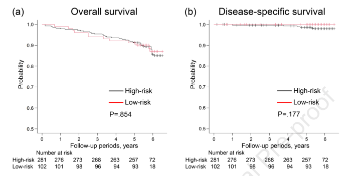 研究结果患者特征:在接受结直肠ESD治疗的2358例患者中,共筛选出2478个早期CRC病灶,其中383个病灶(对应383例患者)经病理确诊为T1期CRC。患者平均年龄±标准差:69.3±10.3岁;男/女:233/150。其中,102例患者(26.6%)属于低危组,281例患者(73.4%)属于高危组,包括74例随访病例(26.3%)和207例手术病例(73.7%)。