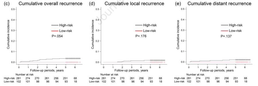 图2. 低危组和高危组的5年OS、DSS、累积总体复发、局部复发和远处复发曲线图