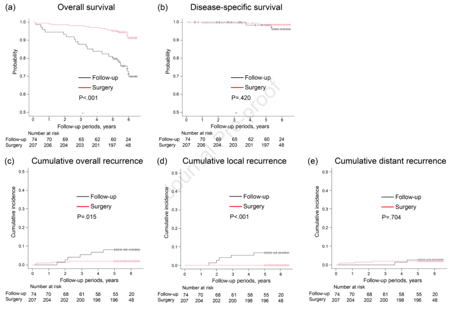 在复发方面,随访组与手术组的5年累积总体复发率分别为8.1%(95%CI:3.3~15.7)与1.9%(95%CI:0.6~4.6),组间差异具有统计学意义(P=0.015);局部复发率分别为6.8%(95%CI:2.5~14.0)与0%,组间差异亦具有统计学意义(P<0.001)(图3c、d)。尤其值得注意的是,手术组在随访期间未发生局部复发,而随访组出现了5例(6.8%)局部复发,组间差异显著(P<0.001)。在远处复发方面,手术组报告了4例(1.9%),随访组报告了2例(2.7%),组间差异无统计学意义(P=0.694)。两组的5年累积远处复发率亦无显著差异(1.9% vs. 2.7%,P=0.704;图3e)。